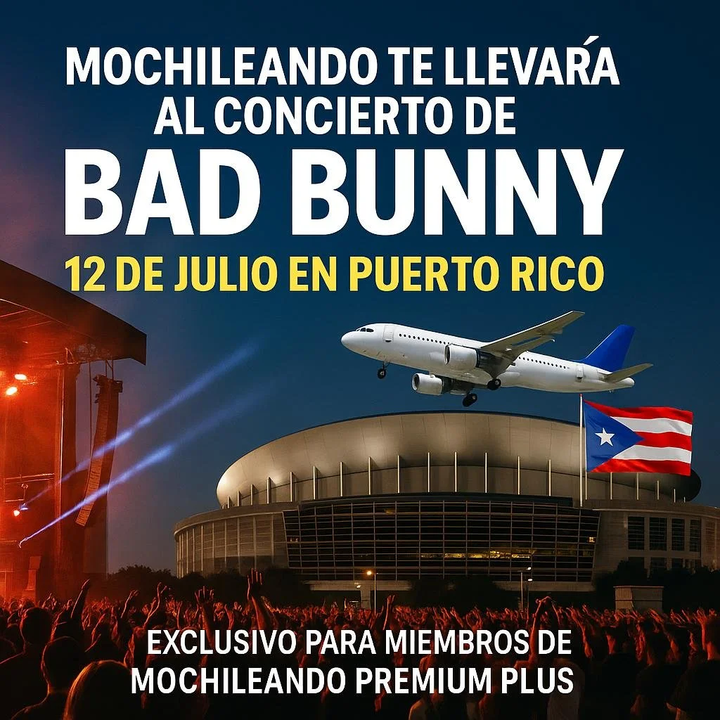 ¡Prepárate para el concierto del año! Mochileando Premium Plus sortea dos boletos para el concierto de Bad Bunny, que se celebrará el 12 de julio de 2025 en Puerto Rico.